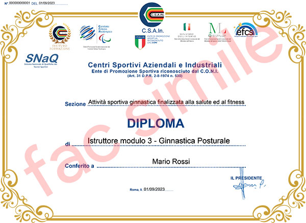 Dopo aver superato l'esame verrà rilasciato il Diploma Nazionale "Istruttore modulo 3 - Ginnastica Posturale" e il Tesserino Tecnico con RCT conformemente a quanto previsto dalla Riforma dello Sport