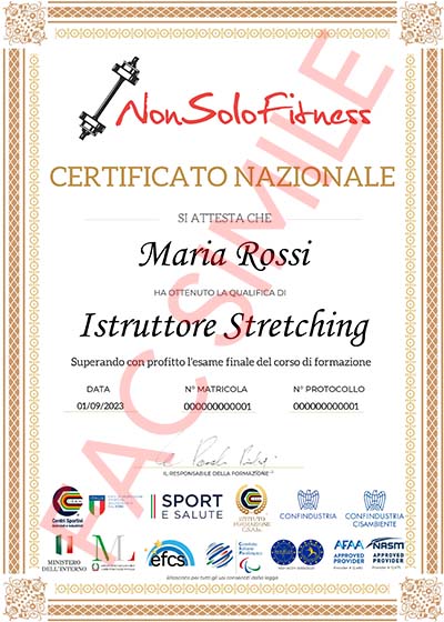 Dopo aver superato l'esame verrà rilasciato il Diploma Nazionale "Istruttore - Stretching" e il Tesserino Tecnico con RCT conformemente a quanto previsto dalla Riforma dello Sport