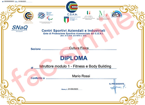 Nei giorni immediatamente successivi al superamento del corso verrà emesso il Diploma Nazionale emesso direttamente dallo CSAIn | eps CONI.