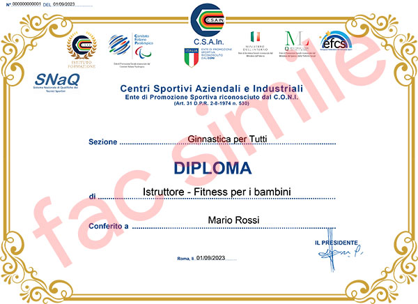 Dopo aver superato l'esame verrà rilasciato il Diploma Nazionale "Istruttore - Fitness per i bambini" e il Tesserino Tecnico con RCT conformemente a quanto previsto dalla Riforma dello Sport