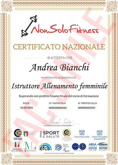 Dopo aver superato l'esame verrà rilasciato il Diploma Nazionale "Istruttore - Allenamento Femminile" e il Tesserino Tecnico con RCT conformemente a quanto previsto dalla Riforma dello Sport