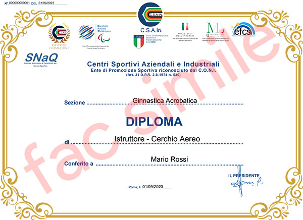 Dopo aver superato l'esame verrà rilasciato il Diploma Nazionale "Istruttore - Cerchio Aereo" e il Tesserino Tecnico con RCT conformemente a quanto previsto dalla Riforma dello Sport