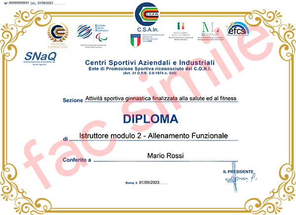 Dopo aver superato l'esame verrà rilasciato il Diploma Nazionale "Istruttore modulo 2 - Allenamento Funzionale" e il Tesserino Tecnico con RCT conformemente a quanto previsto dalla Riforma dello Sport