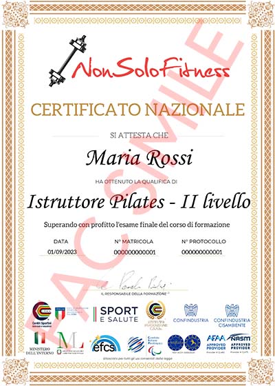 Dopo aver superato l'esame verrà rilasciato il Diploma Nazionale "Istruttore modulo 2 - Pilates" e il Tesserino Tecnico con RCT conformemente a quanto previsto dalla Riforma dello Sport