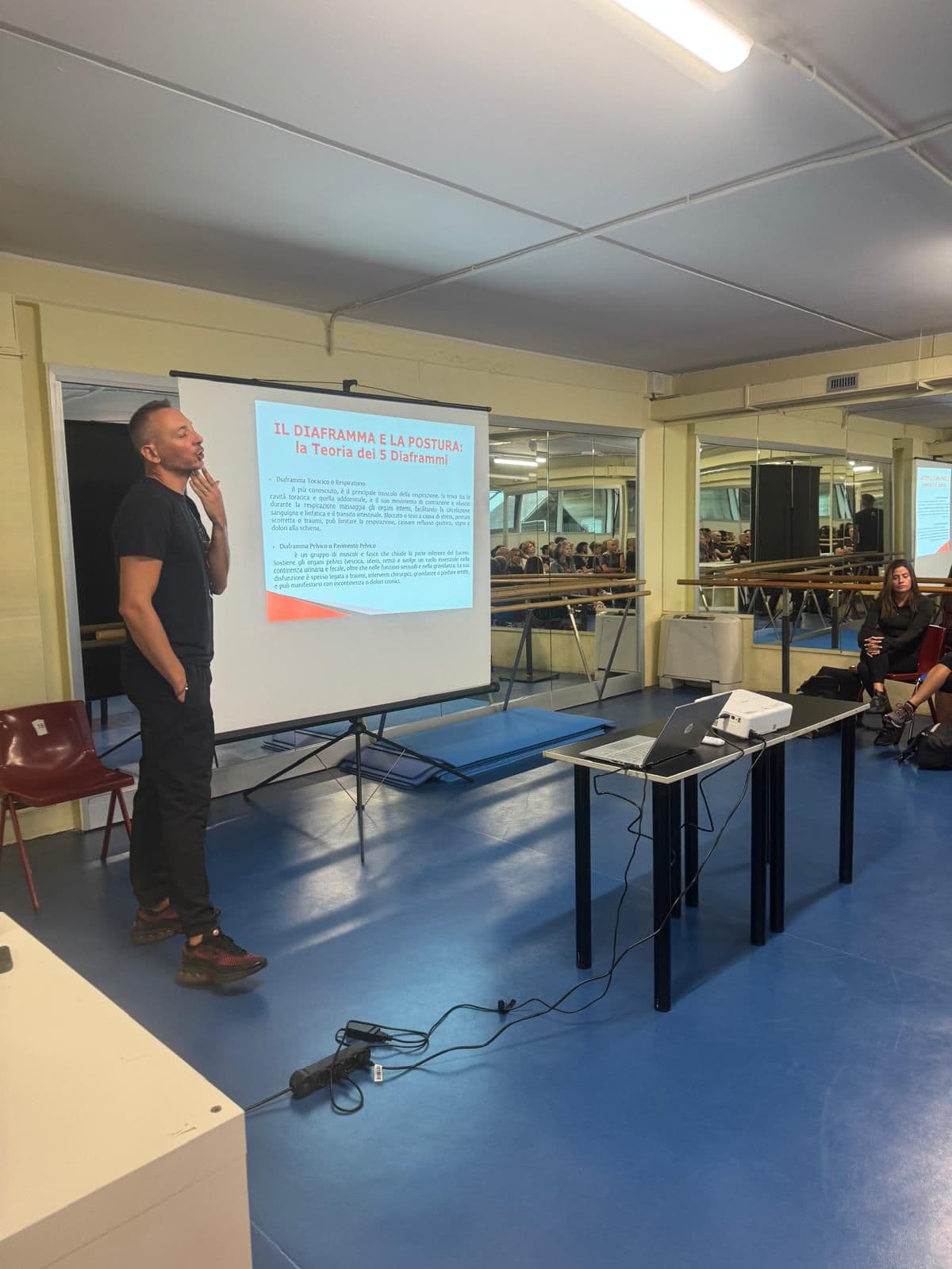 Claudio Cice a Milano. Entrambi i docenti hanno guidato i partecipanti in un percorso di consapevolezza corporea, proponendo esercizi mirati a migliorare la respirazione,